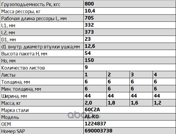 ЧУСОВСКАЯ РЕССОРА 690003738 Рессора задняя для прицепа AL-KO 9 листов