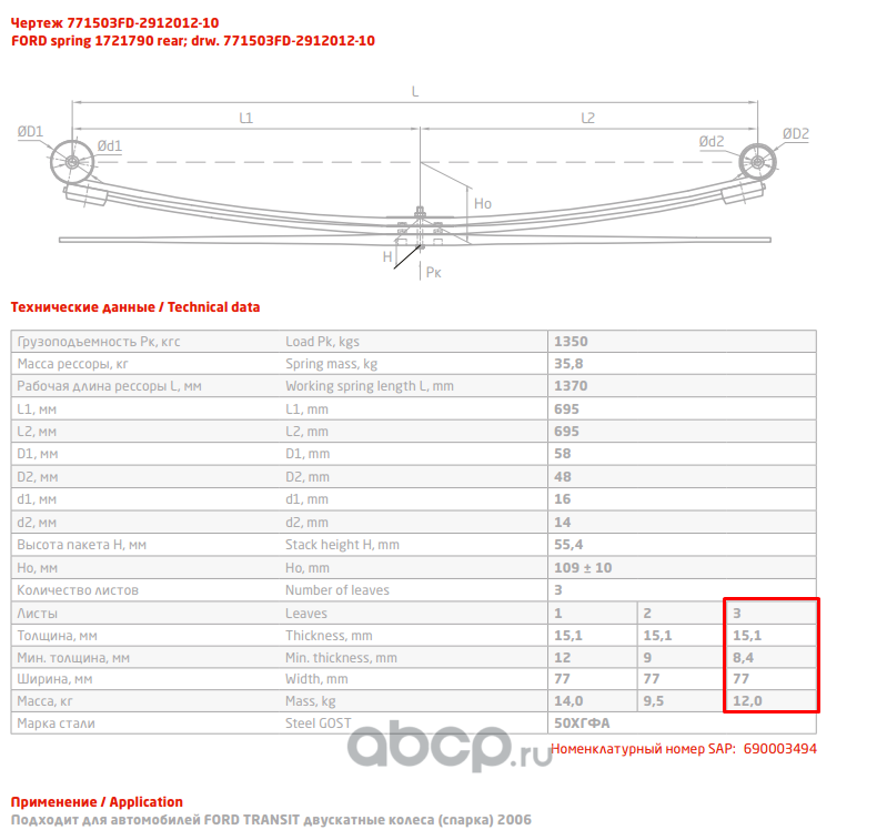 ЧУСОВСКАЯ РЕССОРА 690003106 Лист №3 Рессора задняя для Ford Transit 3 листа