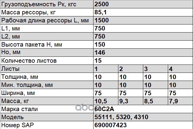 Рессора передняя для грузовиков производства ПАО КамАЗ 65115, 55111, 43118 15 листов