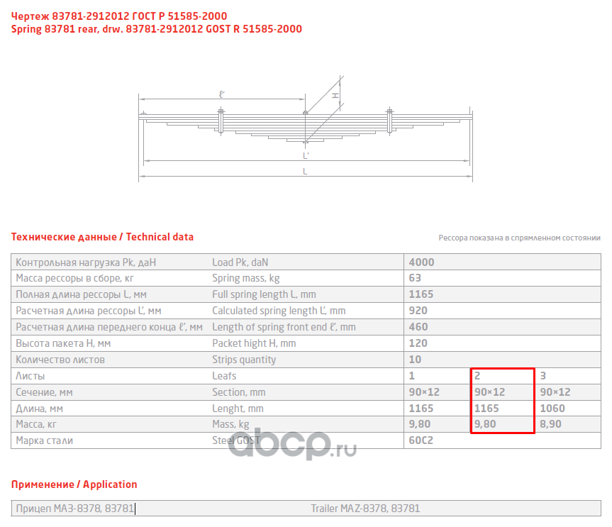 ЧУСОВСКАЯ РЕССОРА 690004402 Лист №2 Рессора задняя для прицепа MA3 8378, 83781 10 листов