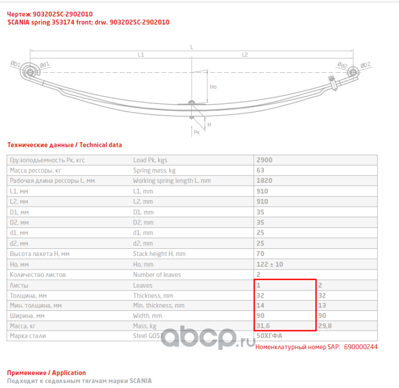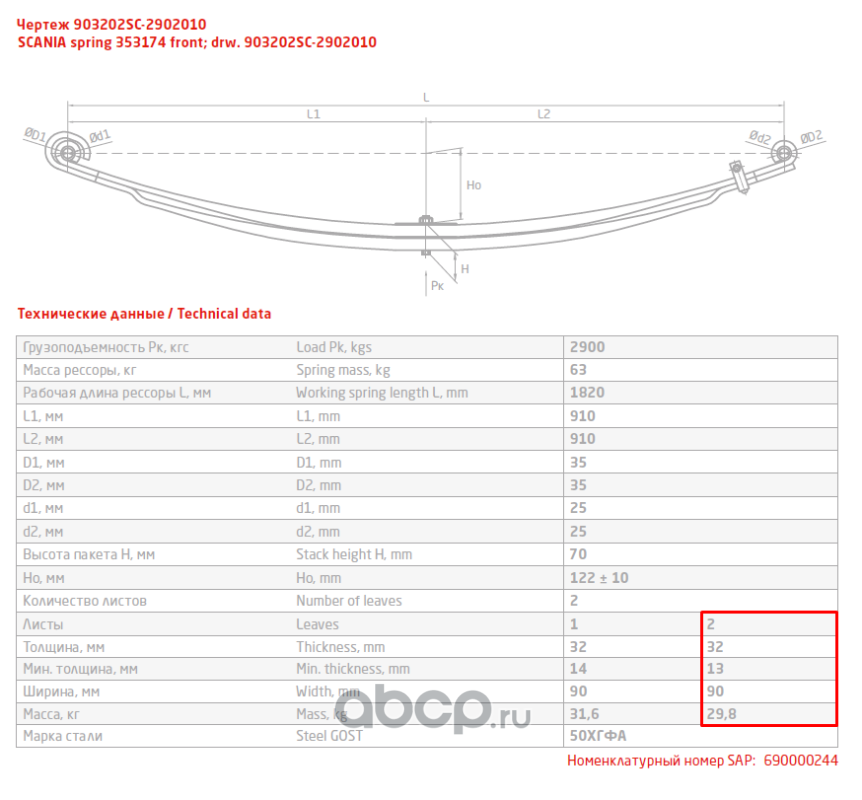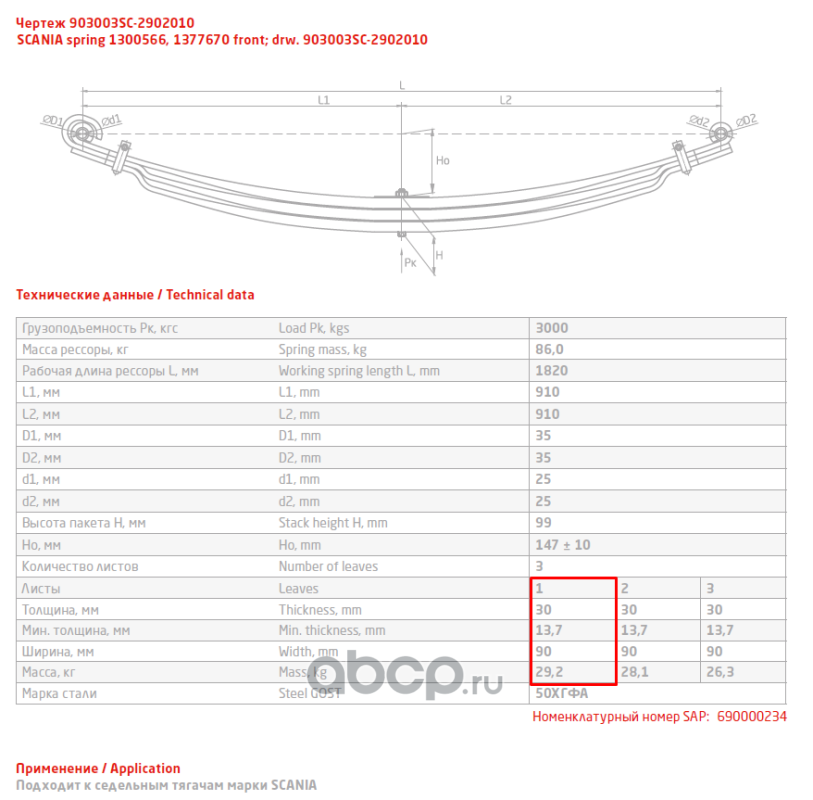 ЧУСОВСКАЯ РЕССОРА 690004033 Лист №1 Рессора передняя для Scania 3-series, 4-series, PGRT-series 2 листа