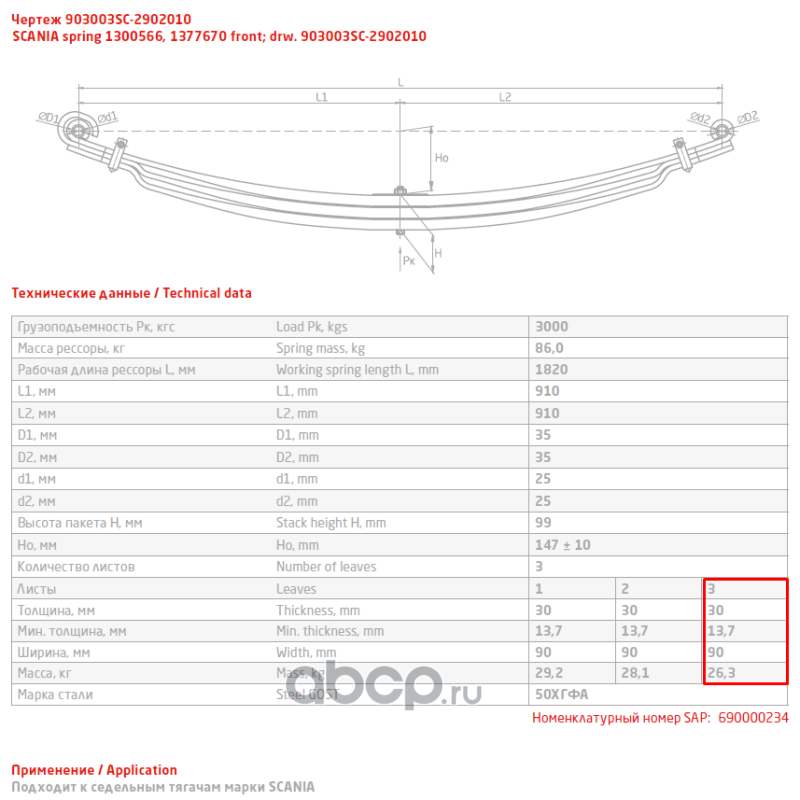 ЧУСОВСКАЯ РЕССОРА 690004028 Лист №1 Рессора передняя для Scania 3-series, 4-series, PGRT-series 3 листа