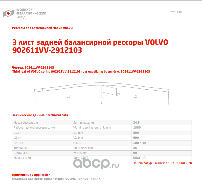 ЧУСОВСКАЯ РЕССОРА 690003370 Лист №3 Рессора задняя для Volvo FH 12, FM 12 11 листов