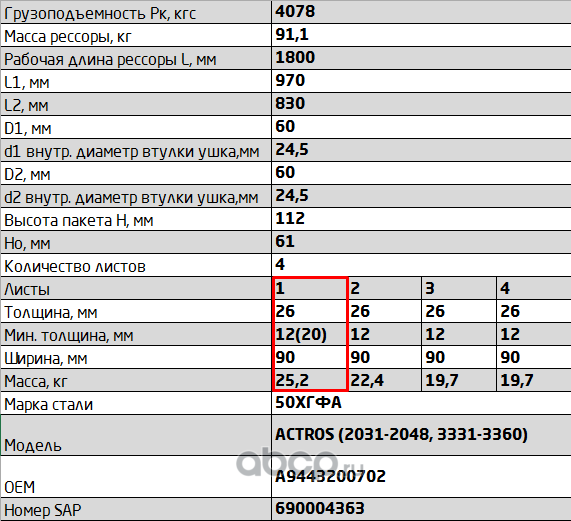 ЧУСОВСКАЯ РЕССОРА 690003696 Лист №1 Рессора передняя для Mercedes Actros 3331-3360, Actros 2031-2048 4 листа