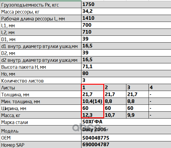 ЧУСОВСКАЯ РЕССОРА 690000065 Лист №1 Рессора задняя для Iveco Daily 1 лист