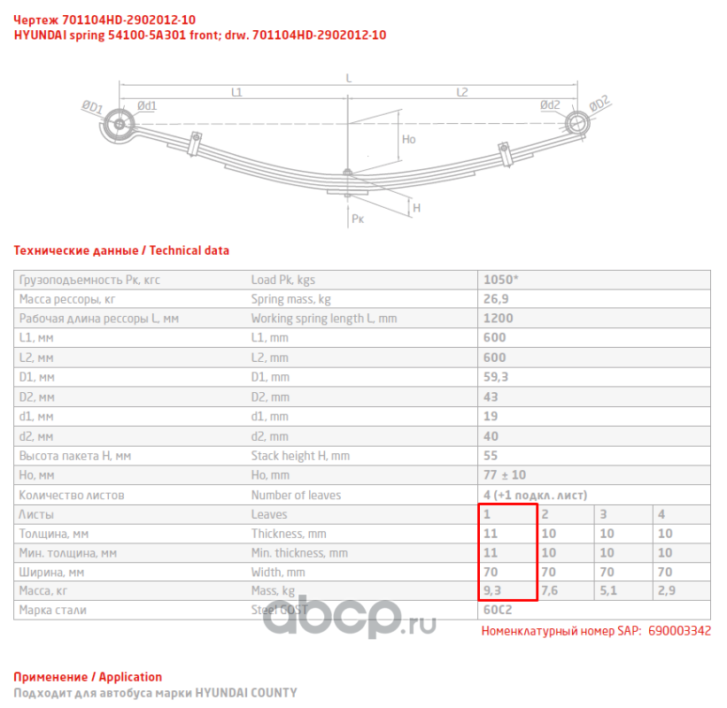 ЧУСОВСКАЯ РЕССОРА 690003339 Лист №1 Рессора передняя для Hyundai County 5 листов
