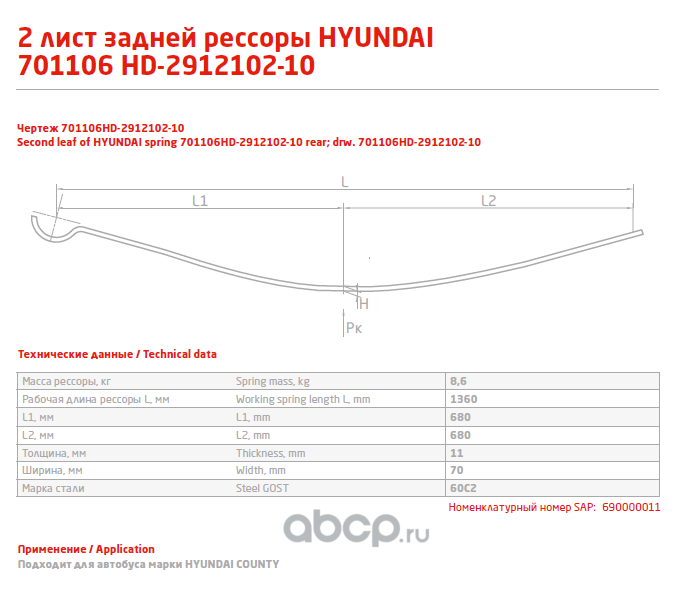 ЧУСОВСКАЯ РЕССОРА 690000011 Лист №2 Рессора задняя для Hyundai County 6 листов