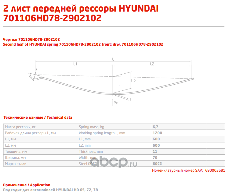 ЧУСОВСКАЯ РЕССОРА 690003691 Лист №2 Рессора передняя для Hyundai HD 65, HD 72, HD 78 6 листов