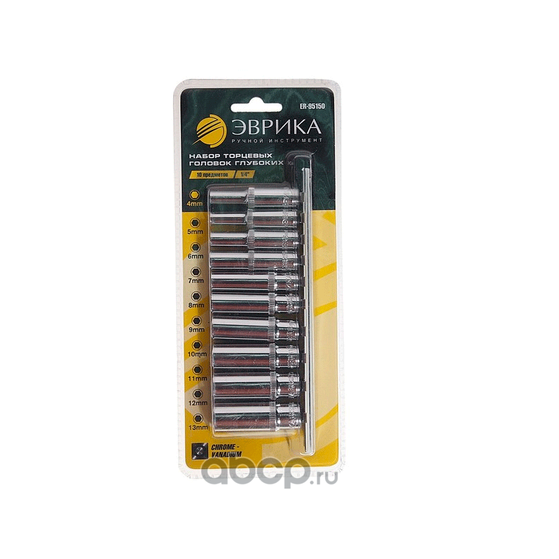 | ЭВРИКА | ER95150 | Набор торцевых головок 1/4" DR глубоких 4-13мм 10 предметов /1/10/50 | ||