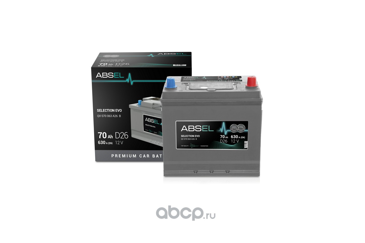 | ABSEL | QV070063A26B | Батарея аккумуляторная 70А/ч 630А 12B обратная полярн. выносные (Азия) клеммы | ||