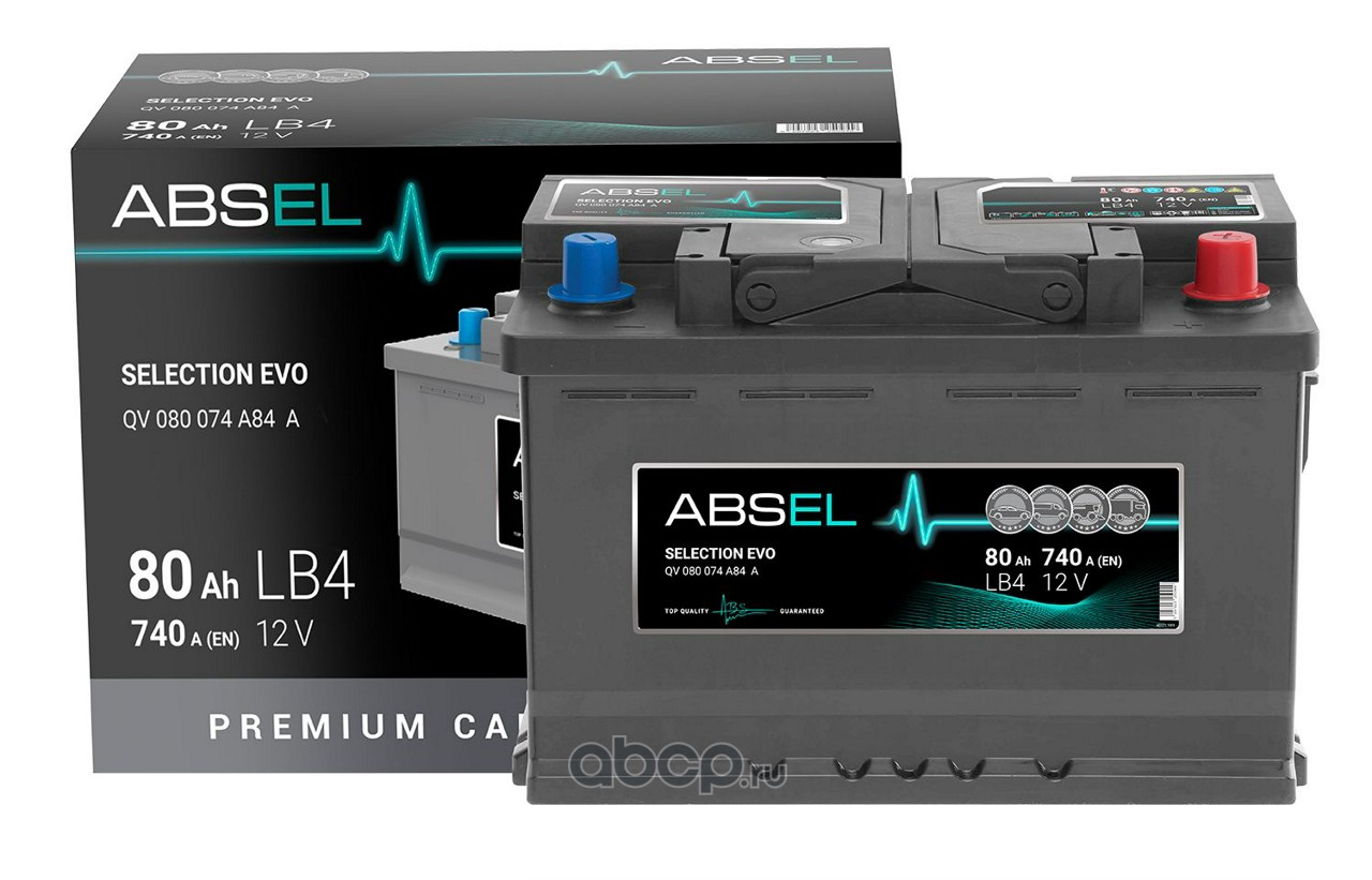| ABSEL | QV080074A84A | Батарея аккумуляторная 80А/ч 740А 12B обратная полярн. стандартные (Европа) клеммы |