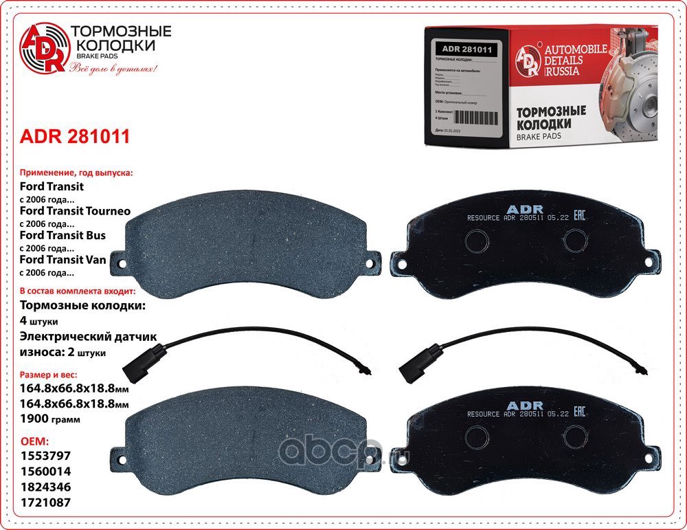 | ADR | ADR281011 | Колодки тормозные передние + 2 датчика FORD Transit 115/140/155 л.с. >06, OEM 1371402, RESOURCE | ||