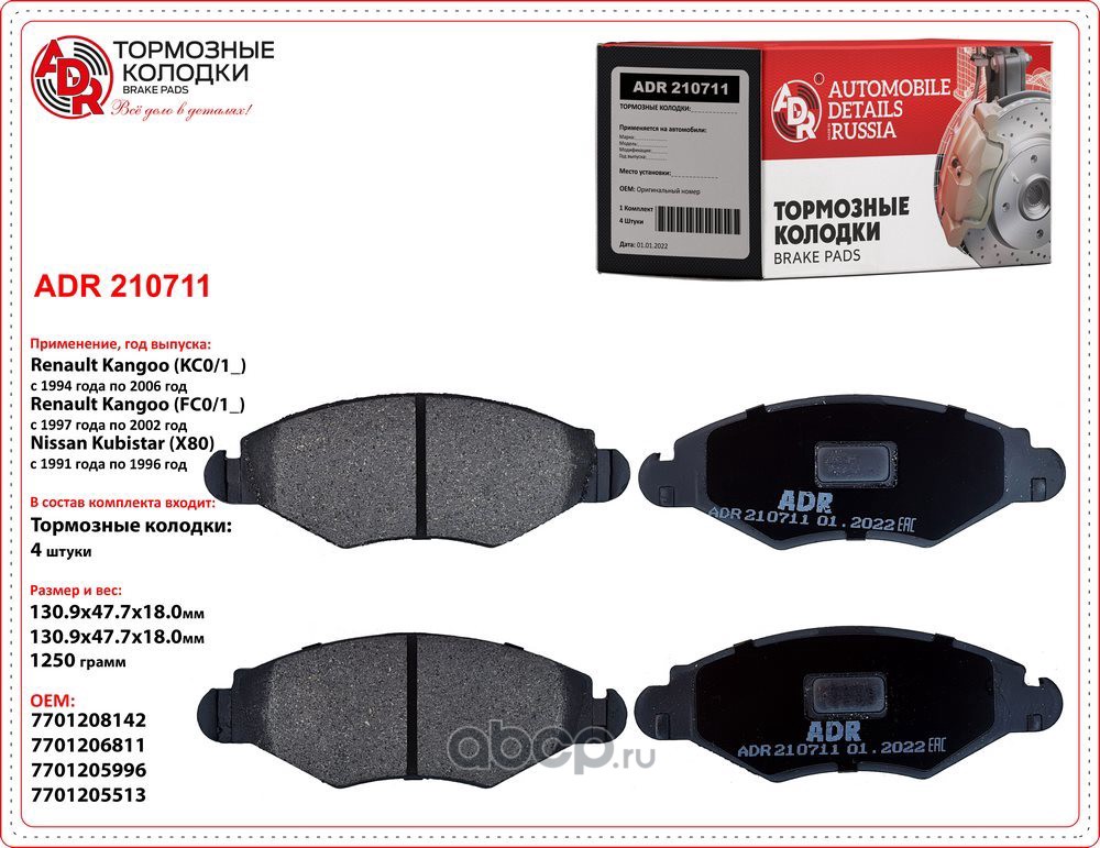 | ADR | ADR210711 | Колодки тормозные передние RENAULT Kangoo, Symbol, CITROEN Xsara, OEM 8671014265 | ||