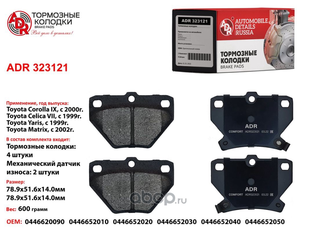 | ADR | ADR323121 | Колодки тормозные задние TOYOTA Corolla, Yaris, OEM 04466-52030, мех. датчик | ||