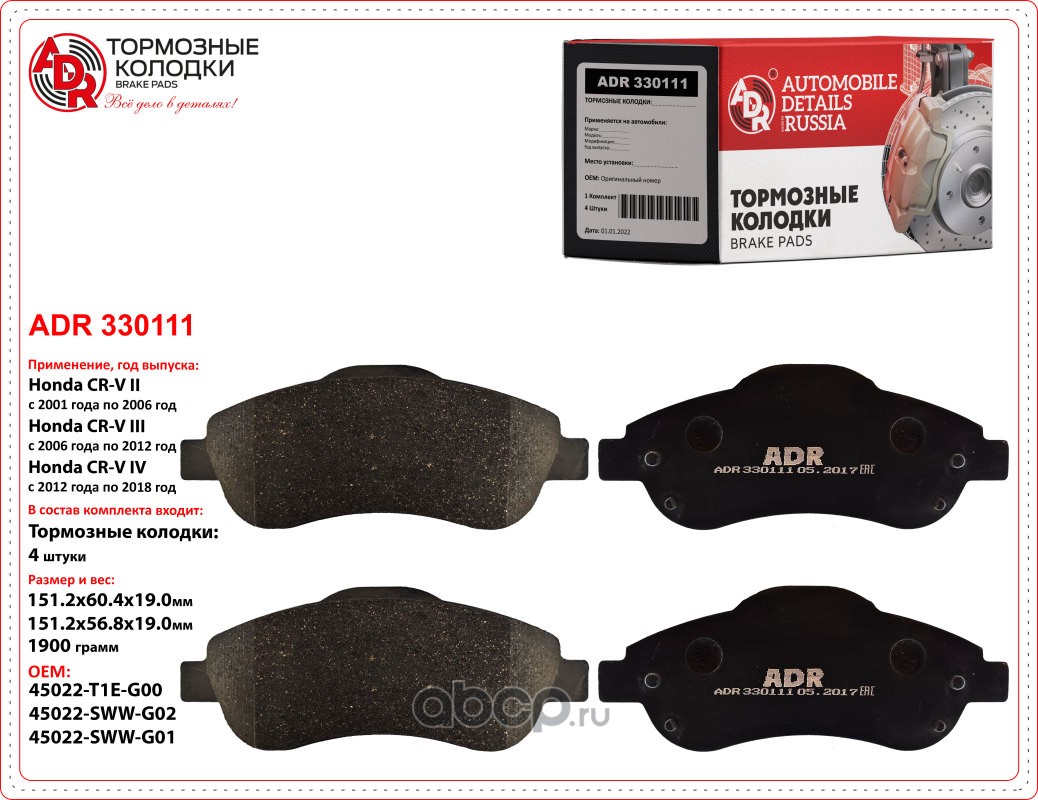| ADR | ADR330111 | Колодки тормозные передние HONDA CR-V III, IV, ACURA RDX OEM 45022SWWG02 | ||