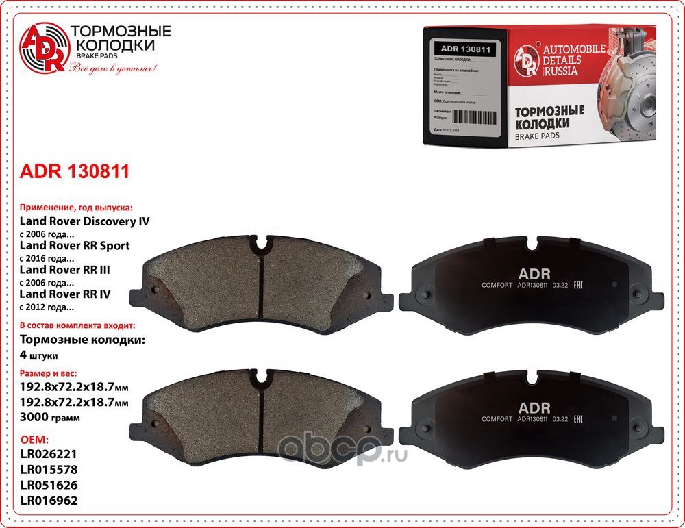 | ADR | ADR130811 | Тормозные колодки передние ADR130811 LAND ROVER Range Rover III | ||