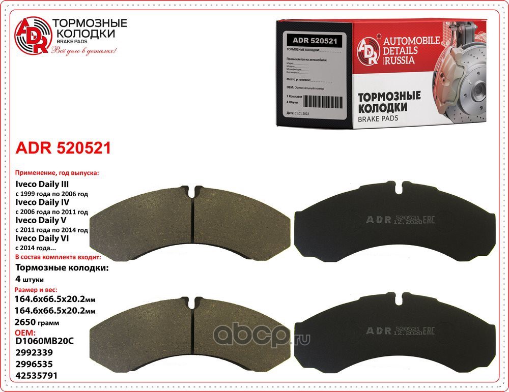 | ADR | ADR520521 | Колодки тормозные IVECO Daily II, III, OEM 2992339 | ||