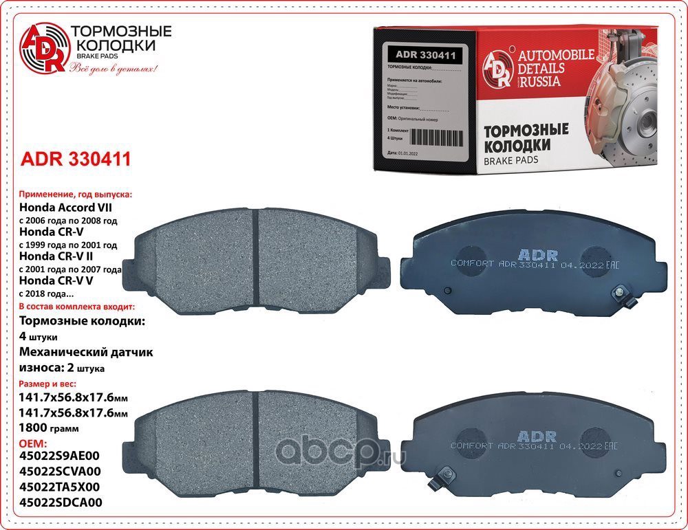| ADR | ADR330411 | Колодки тормозные передние HONDA Accord VII, CR-V II, OEM 45022-S9A-E00, мех датчик | ||