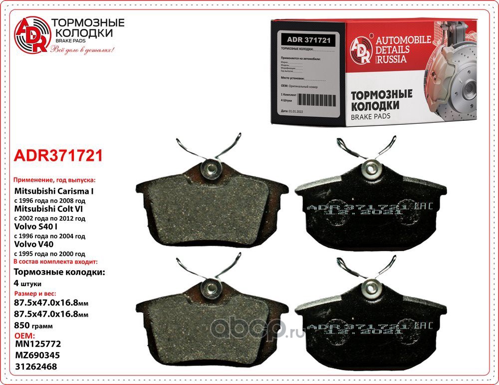 | ADR | ADR371721 | Колодки тормозные задние VOLVO S40, MITSUBISHI Carisma, Colt, Space Star, с мех.дат. | ||