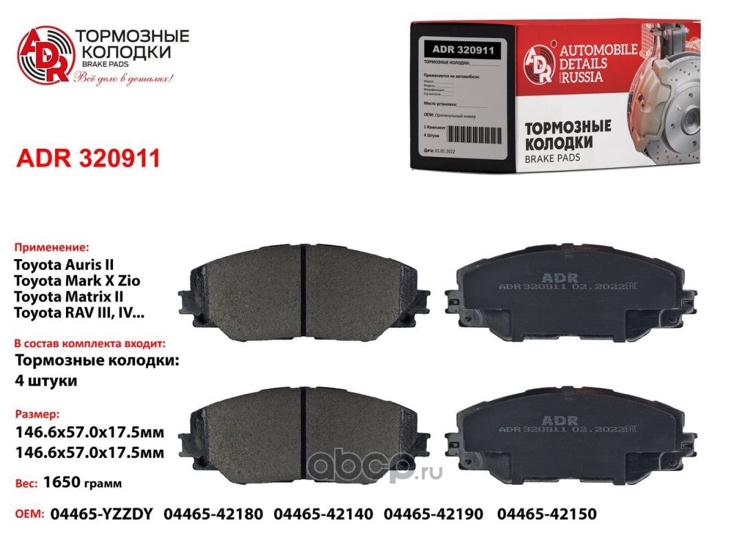 | ADR | ADR320911 | Колодки тормозные передние TOYOTA Auris, RAV 4 III, IV, Premio OEM 04465-42180 | ||