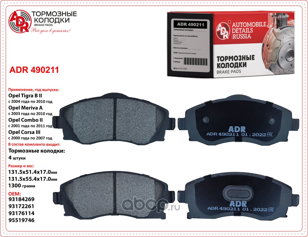 | ADR | ADR490211 | Колодки тормозные передние OPEL Combo, Corsa B, Corsa C, Tigra B OEM 1605081 | ||