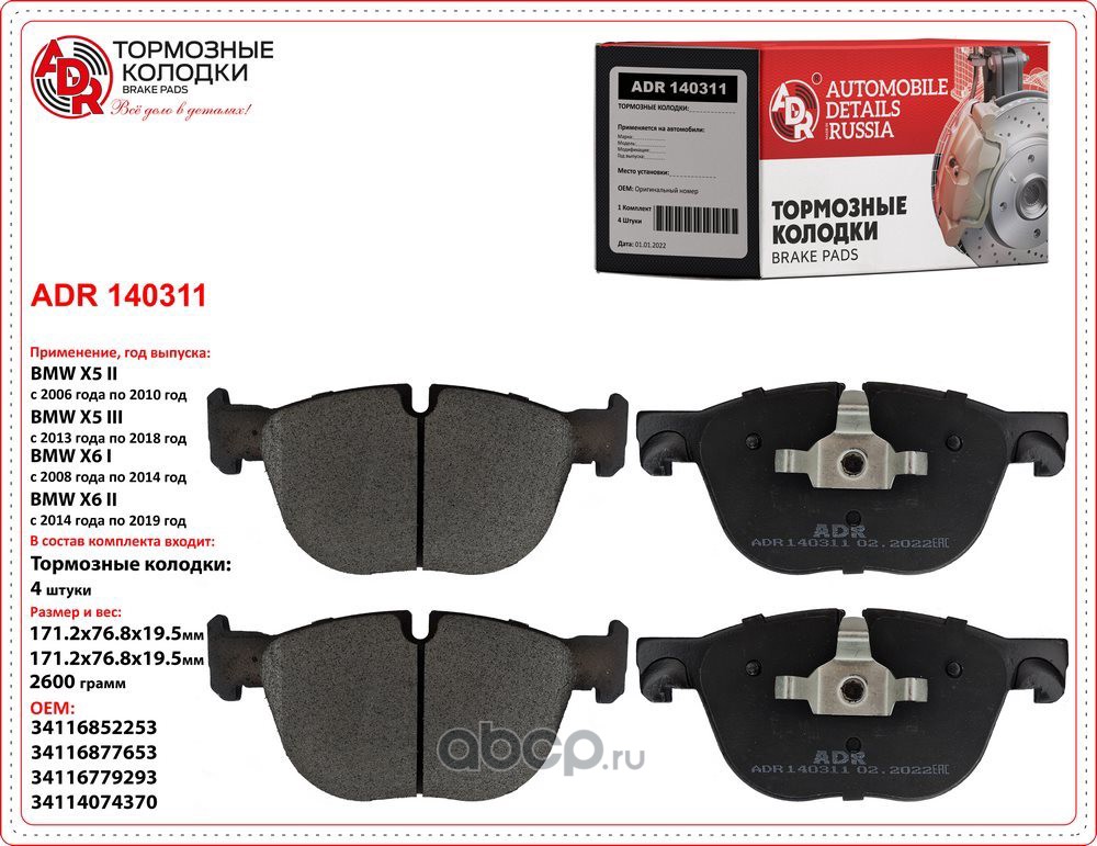 | ADR | ADR140311 | Колодки тормозные передние BMW X5 II, X5 III, X6, OEM 34116857096 | ||