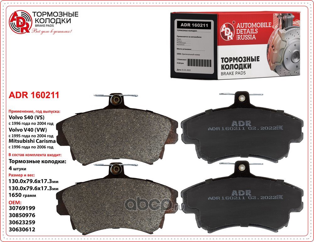 | ADR | ADR160211 | Колодки тормозные передние VOLVO S40, V40, MITSUBISHI Carisma, OEM 30769199 мех.датчик | ||