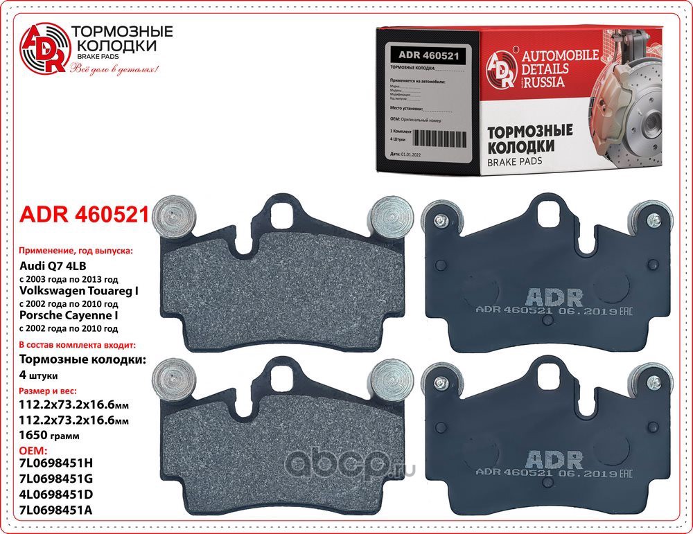 | ADR | ADR460521 | Колодки тормозные задние AUDI Q7, VW Touareg, PORSCHE Cayene, OEM 7L0698451G | ||