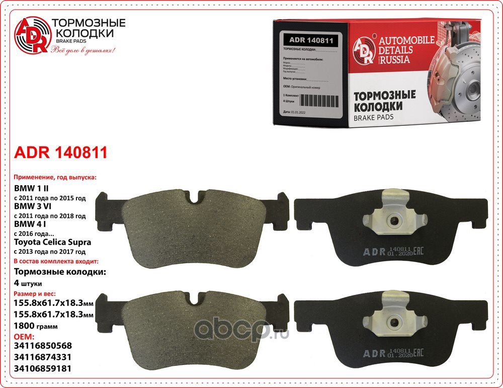 | ADR | ADR140811 | Колодки тормозные передние BMW 1, 3, 4, OEM 34116874331 | ||