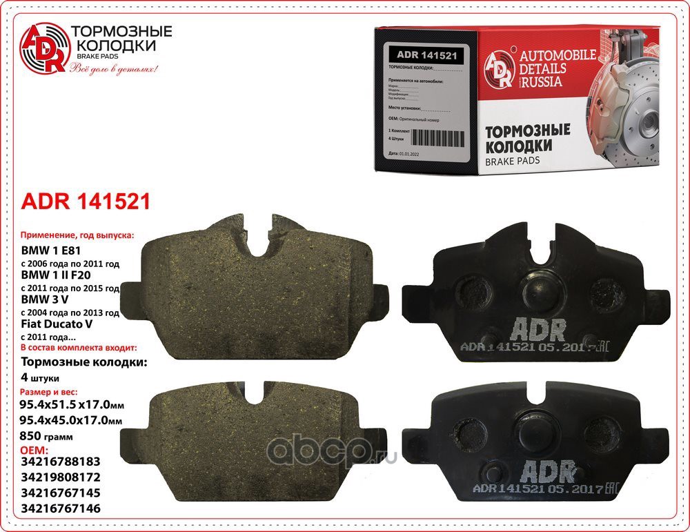 | ADR | ADR141121 | Колодки тормозные задние BMW 1, 2, 3, 4, OEM 34216850569 | ||
