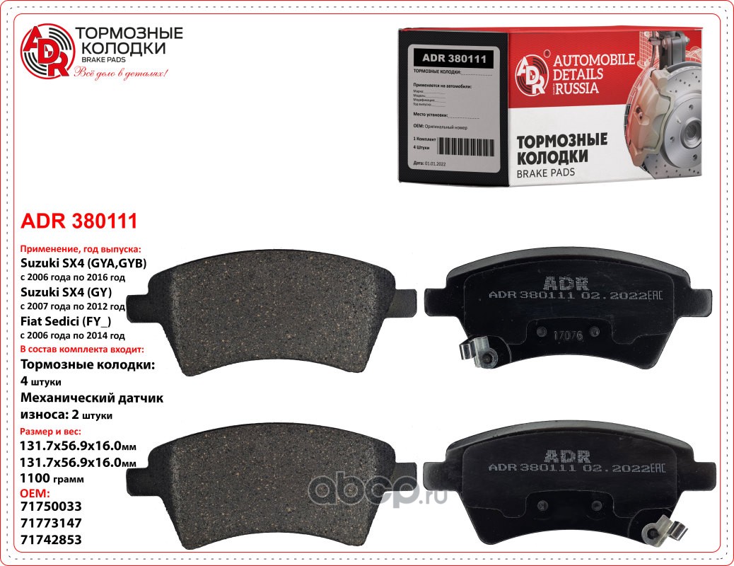 | ADR | ADR380111 | Колодки тормозные передние SUZUKI SX4, FIAT Sedici OEM 5581079J1, мех.датчик | ||