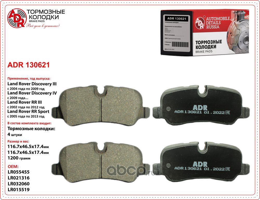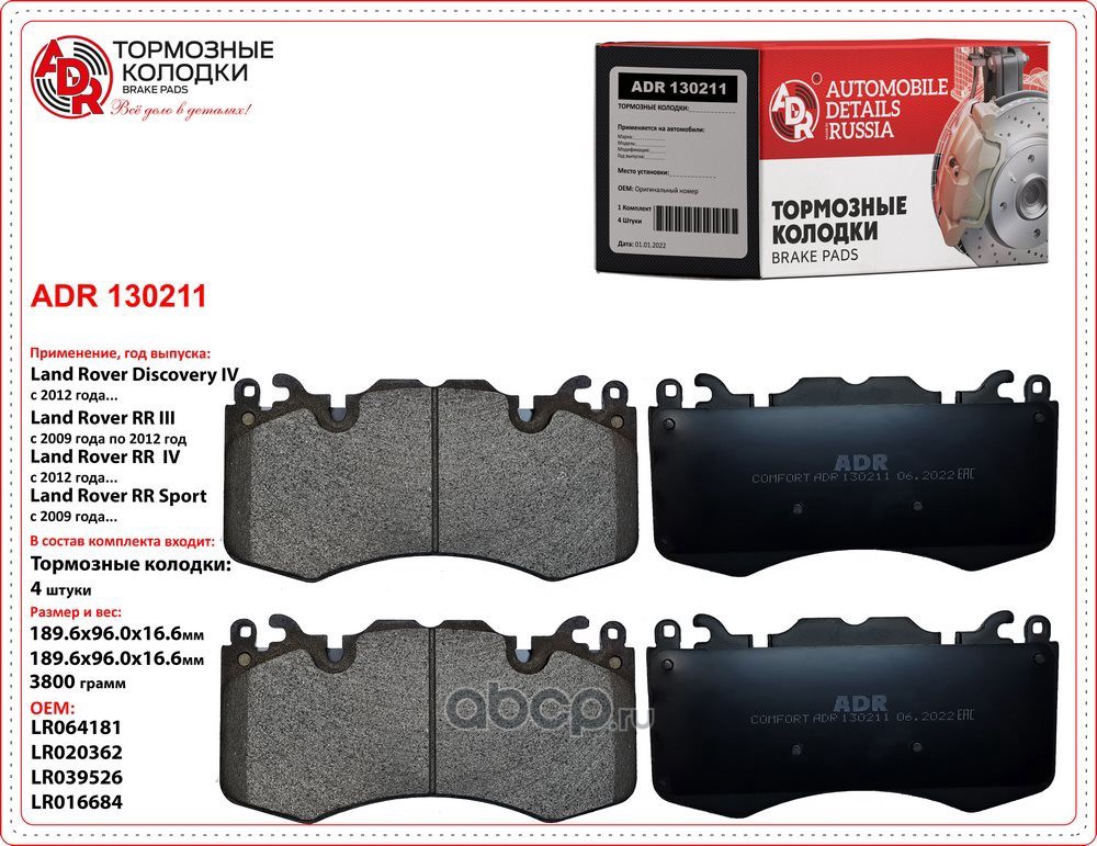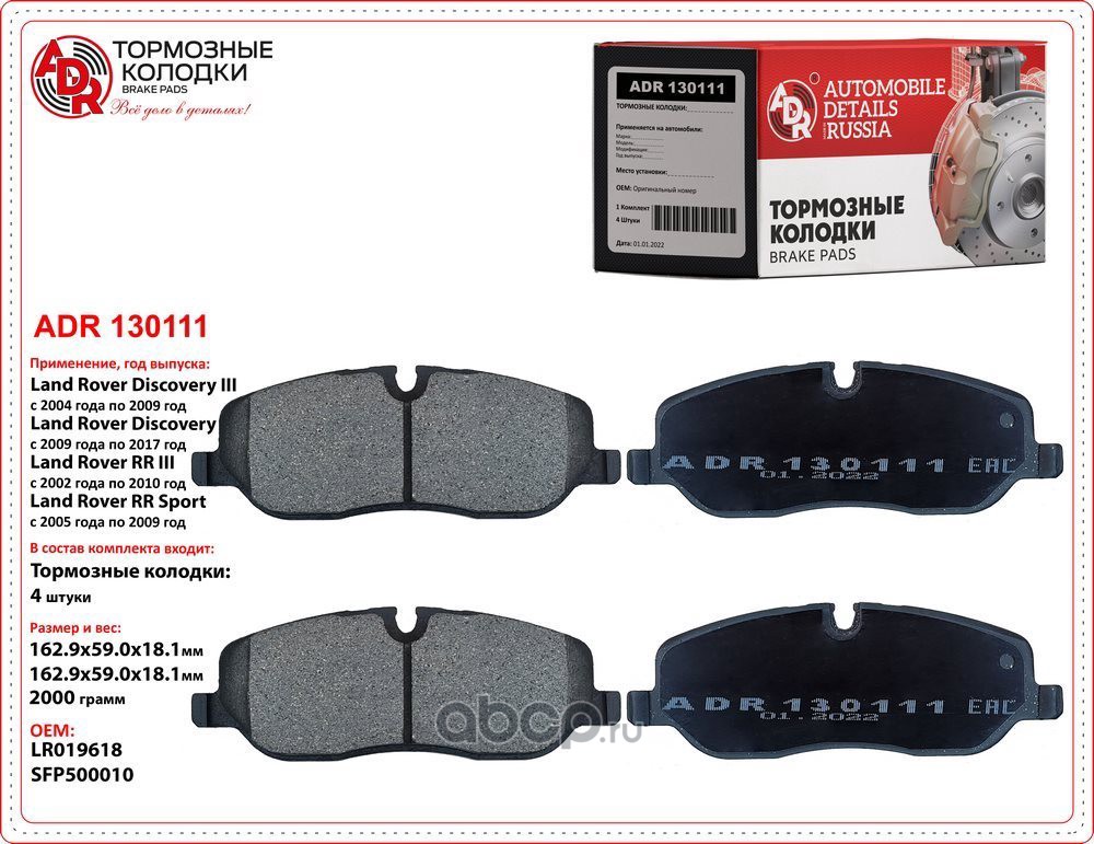 | ADR | ADR130111 | Колодки тормозные передние LAND ROVER Discovery, Range Rover, OEM LR019618 | ||