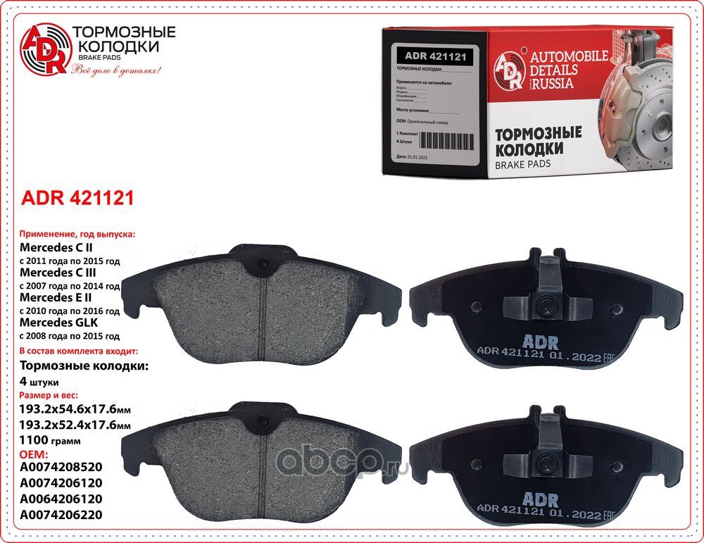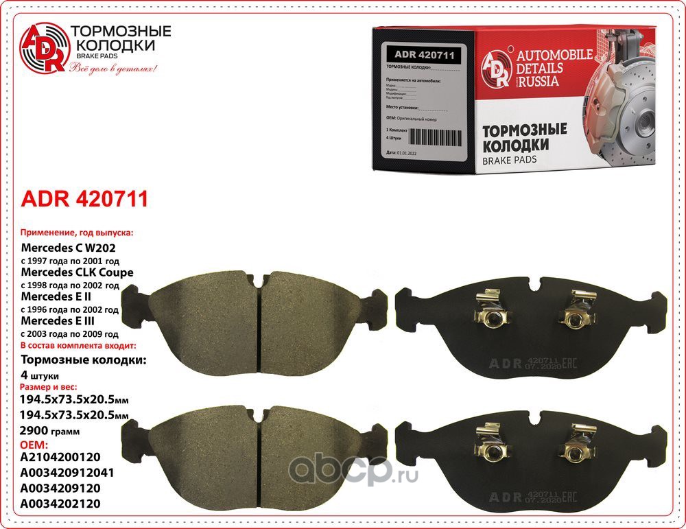 | ADR | ADR420711 | Колодки тормозные передние MERCEDES, AUDI, VW, OEM A2104200120 | ||