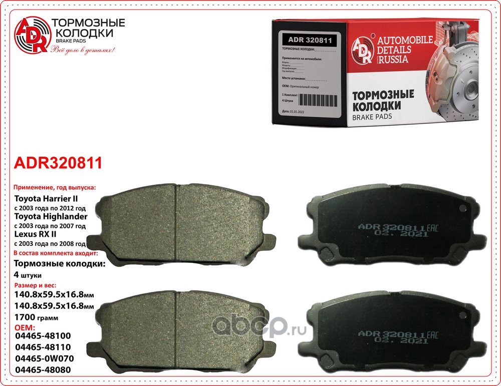 | ADR | ADR320811 | Колодки тормозные передние TOYOTA Harrier II, LEXUS RX II, III OEM 04465-0W070 |