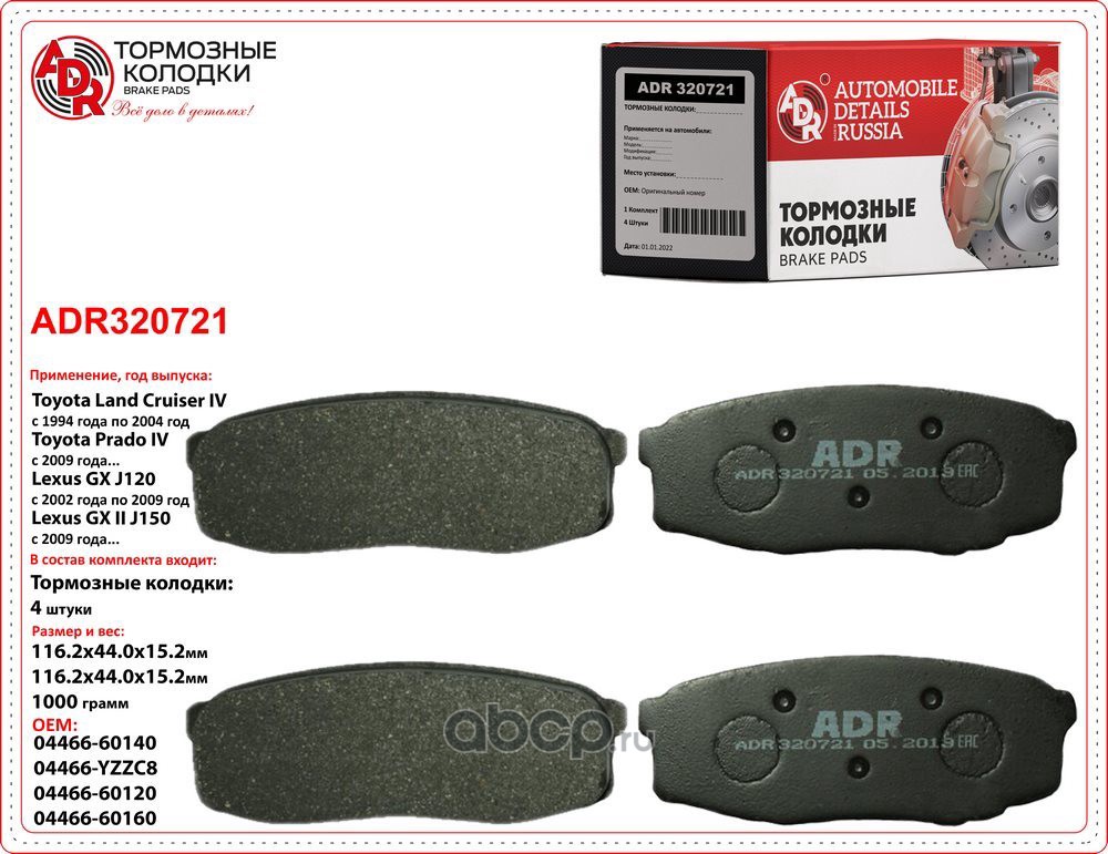 | ADR | ADR320721 | Колодки тормозные задние TOYOTA Land Cruiser, LEXUS LX III, OEM 04466-6016 | ||