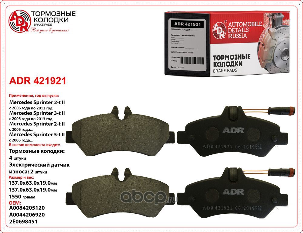 | ADR | ADR421921 | Колодки тормозные задние с датчиком MB Sprinter >06, VW Crafter >06, OEM A0084205120 | ||