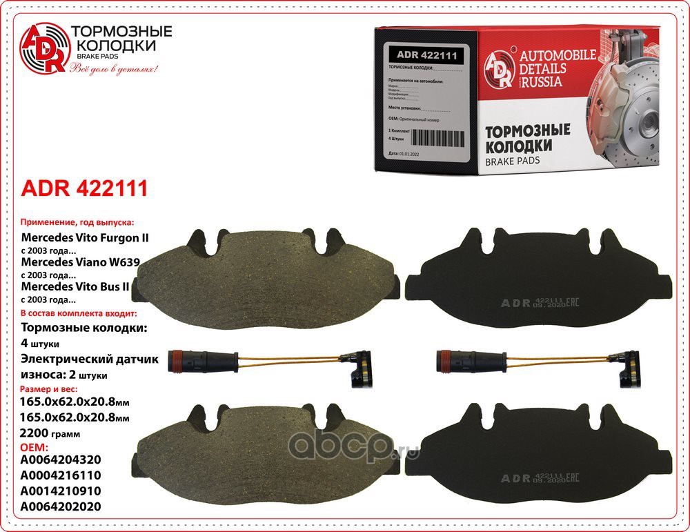 | ADR | ADR422111 | Колодки тормозные передние MERCEDES Viano, Vito II, OEM A0064204320 | ||