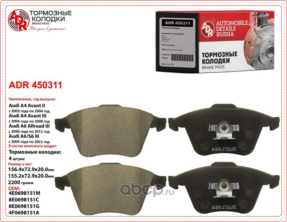 | ADR | ADR450311 | Колодки тормозные передние AUDI A4 III, A6 III, A6/S6 III, OEM 4F0698151D с датчиком | ||