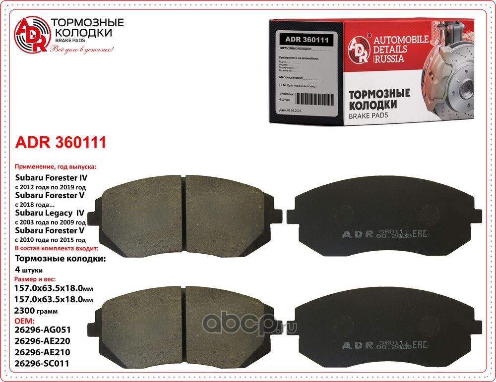 | ADR | ADR360111 | Колодки тормозные передние SUBARU Forester, Impreza, Legacy, OEM 26296AG010 | ||
