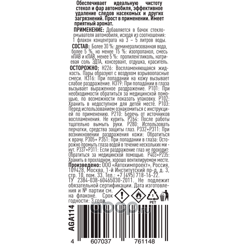 | AGA | AGA114 | Концентрат для приготовления летней стеклоомывающей жидкости | ||