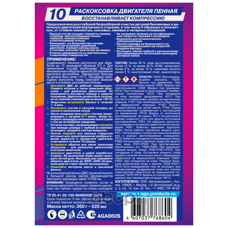 | AGA | AGA860S | Раскоксовка двигателя пенная | ||