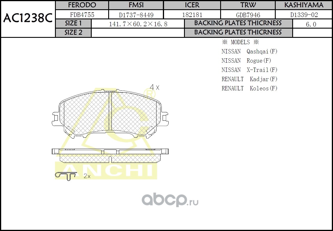 | ANCHI | AC1238C | Тормозные колодки дисковые | ||