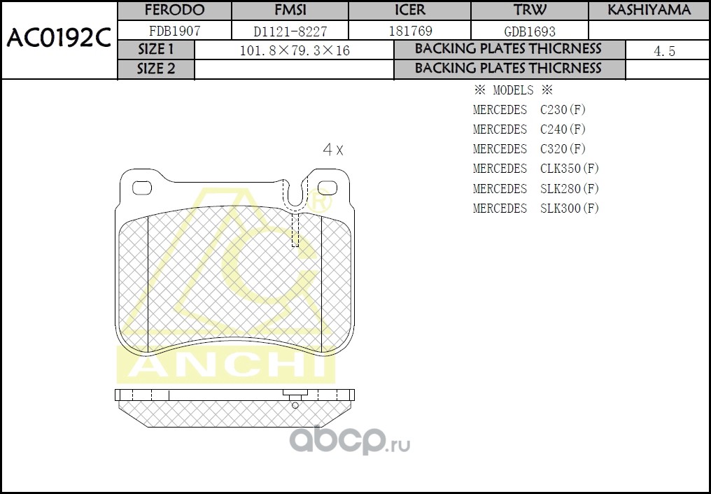 | ANCHI | AC0192C | Тормозные колодки дисковые | ||