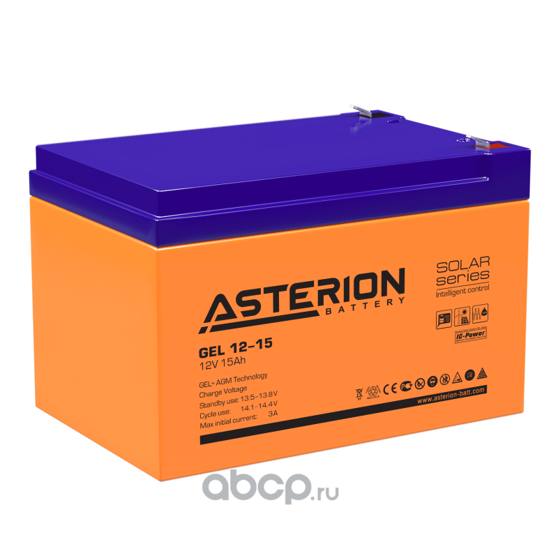| ASTERION BATTERY | GEL1215 | Батарея аккумуляторная 15А/ч прямая полярн. F2 (под клемму 250) клеммы | ||