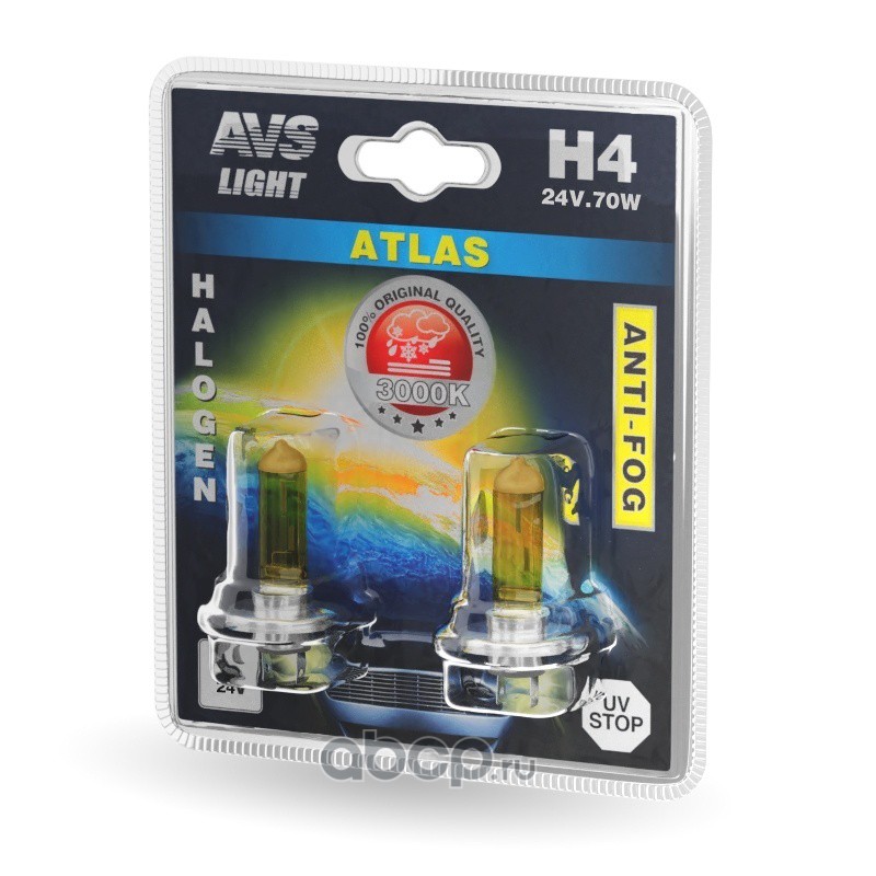 | AVS | A78629S | Лампа галогенная AVS ATLAS ANTI-FOG / желтый H4.24V.75/70W (блистер, 2 шт.) | ||