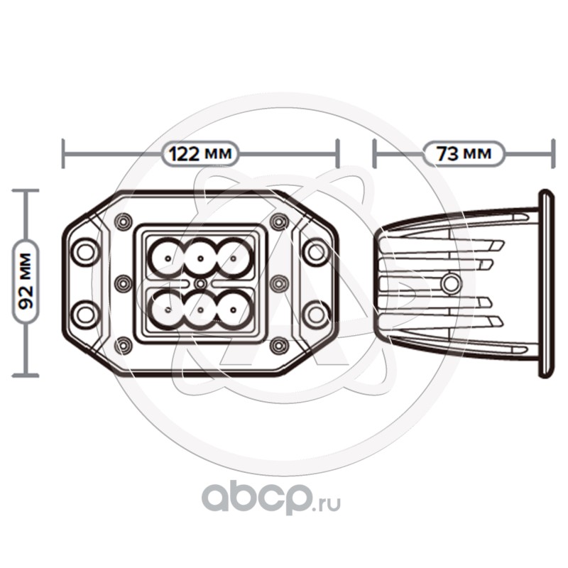 Фара светодиодная дополнительная, прямоугольная 122*73*92, рассеянный свет, 6 диодов, встраиваемая, 18 Вт, 10-30 В