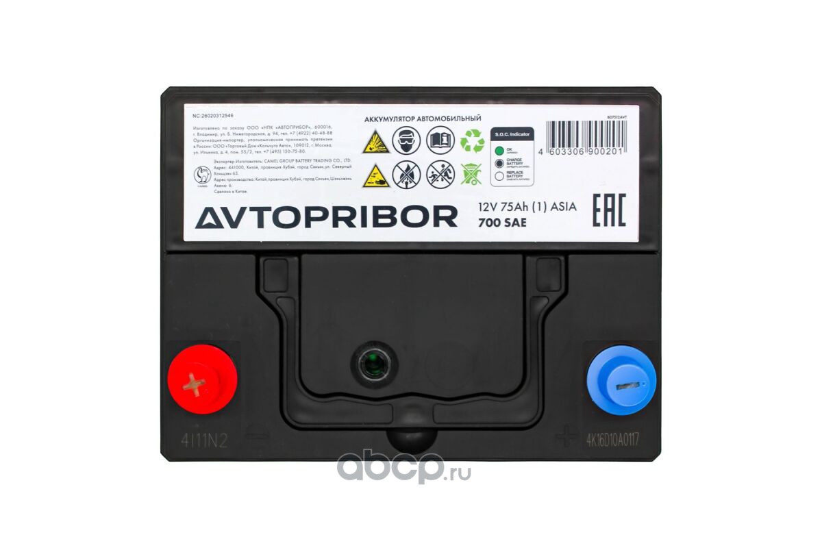 | AVTOPRIBOR | B07512AVT | Батарея аккумуляторная 75А/ч 700А прямая полярн. тонкие вынос. (Азия) клеммы | ||