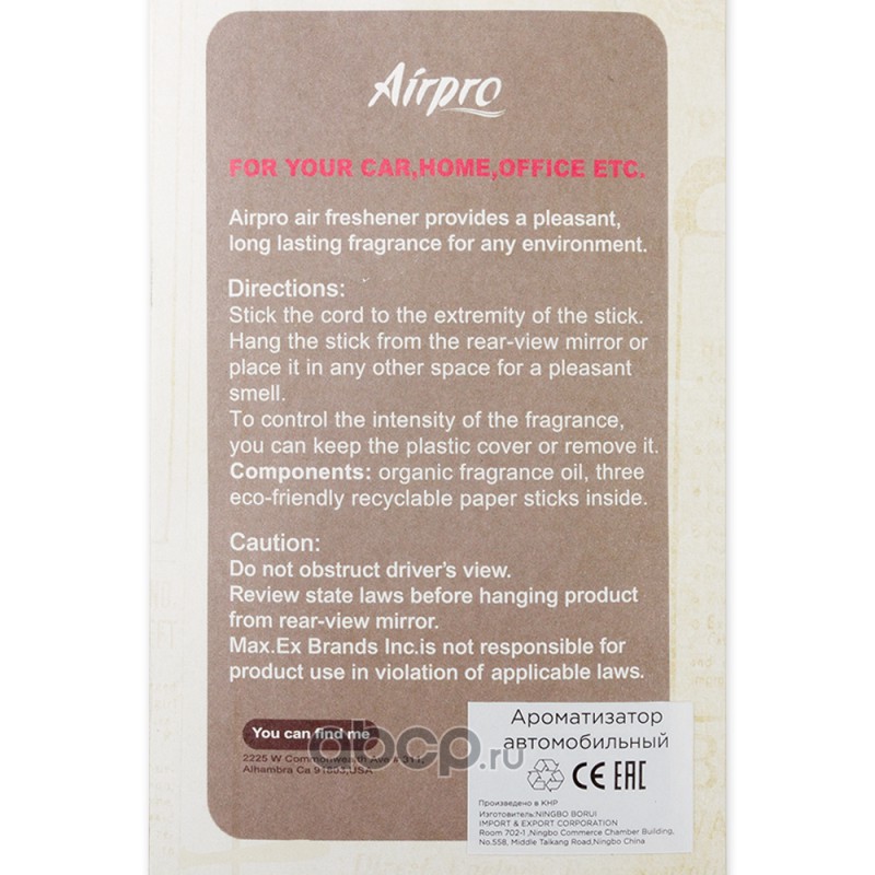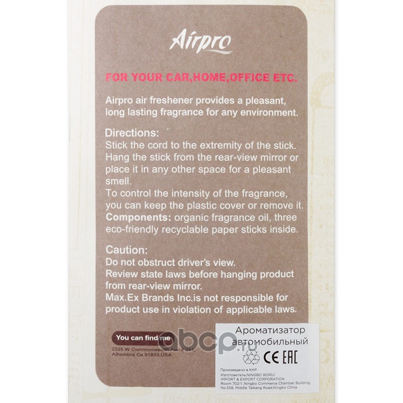 | Airpro | 1107031 | Ароматизатор бумажные палочки пропитанный пластинка вишня AIRPRO | ||