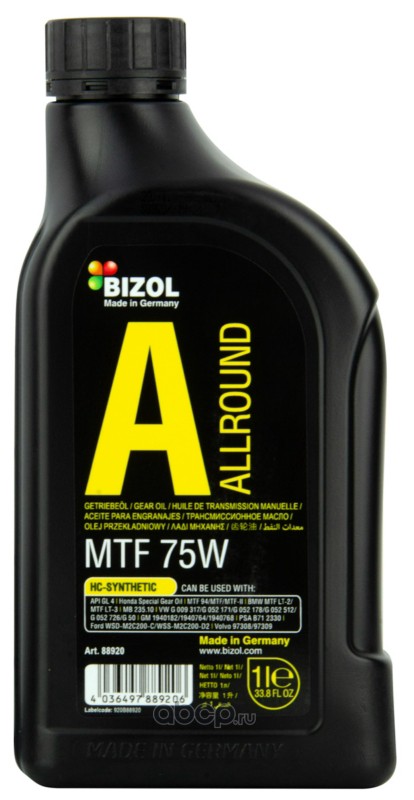 | BIZOL | 88920 | Синтетическое трансмиссионное масло Allround Gear Oil MTF 75W 1л | ||