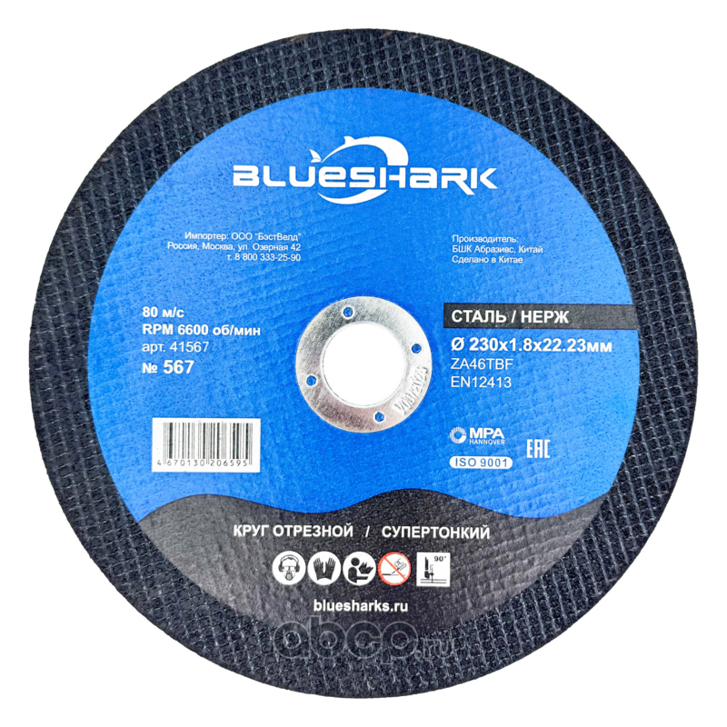 | BLUESHARK | 41567 | Круг отрезной по стали № 567, 230*1,8*22 мм steel + INOX | ||
